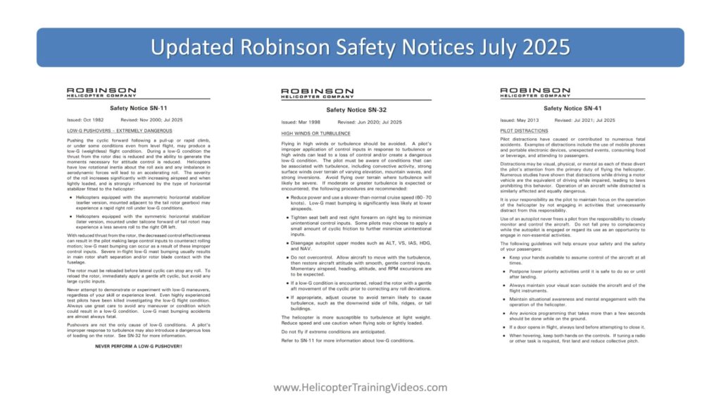 Robinson Helicopters has just released (July 2025) important updates to three Safety Notices (SN-11, SN-32, and SN-41) that every R22, R44, and R66 pilot should review. These updates are based on accident data, advances in technology, and a deeper understanding of flight dynamics – with the goal of improving safety through education and awareness.