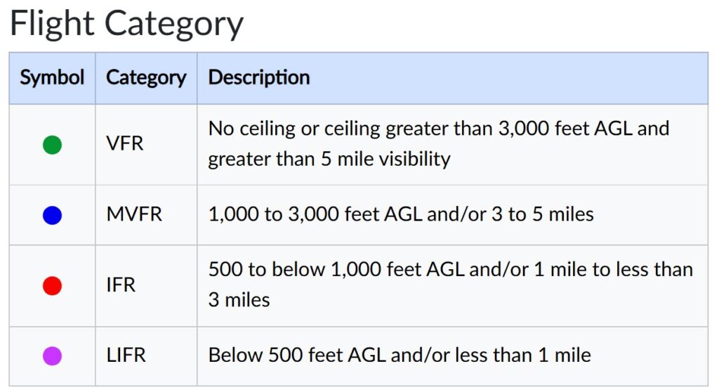 The color classifications are based only on ceilings (broken or overcast layers), not scattered or few layers of cloud.